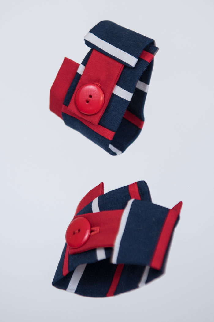 Unikatna pamučna narukvica s bijelim i crvenim prugama na tamno plavoj podlozi. Kopčanje na jedno crveno dugme. Tkanina je elastična s nježnim elegantnim sjajem.